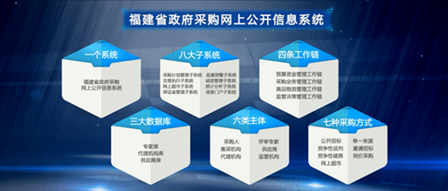 该系统以一个平台、三大数据库、八大子系统为基础构架。对六类主体、四条工作链、七种采购方式、200多项细化流程进行组合。建立了全省统一的政府采购市场规则体系,在全国率先实现了省市县三级全覆盖,也是全国首个实现采购业务全流程电子化和在线监管的信息系统。