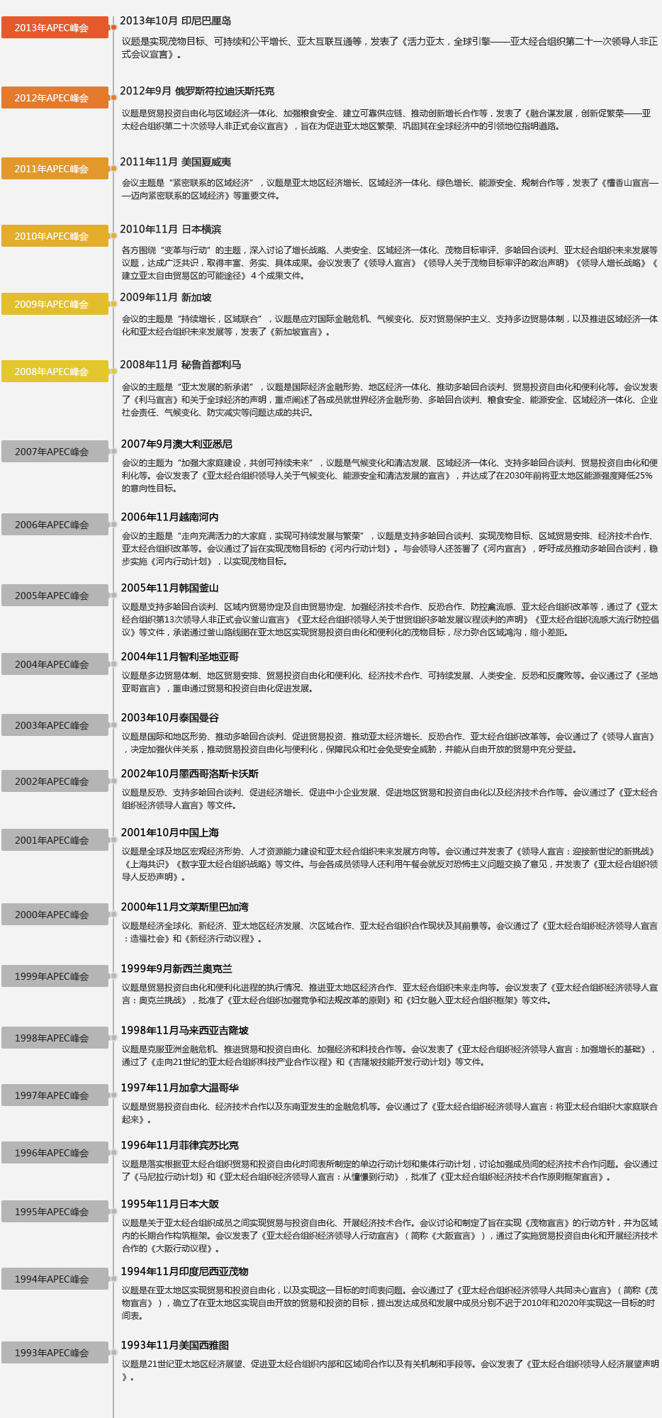 亚太经合组织是亚太地区层级最高、领域最广、最具影响力的经济合作机制。1989年11月5日-7日,澳大利亚、美国、日本、韩国、新西兰、加拿大以及当时的东盟六国在澳大利亚首都堪培拉举行APEC首届部长级会议,标志着APEC正式成立。 APEC的宗旨是为本地区人民的共同生产单位保持经济增长和发展;促进成员间经济相互依存;加强开放的多边贸易体制;减少区域贸易和投资壁垒。【阅读全文】