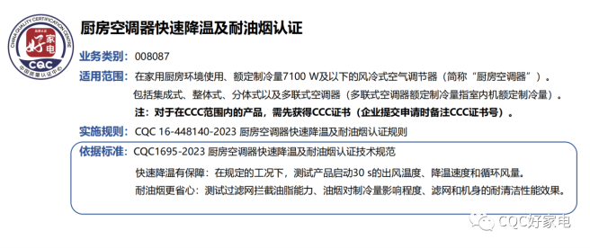 为积极响应市场热点需求,帮助消费者快速识别高端优质厨房空调器,中国质量认证中心(CQC)联合中国家用电器研究院共同研发了厨房空调器器快速降温及耐油烟认证。