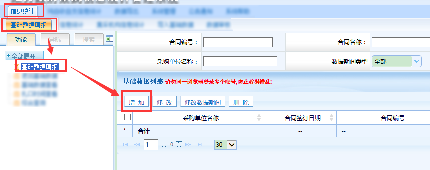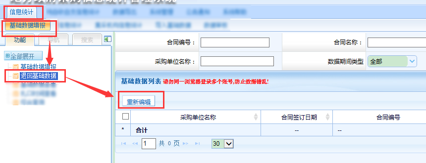 第四步,下级单位上报数据后,监管单位在其他合同信息统计页面接受汇总报表。