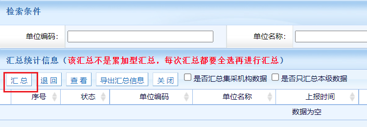 接收数据完成后,点击汇总按钮,系统弹出汇总页面,全部勾选数据后,点击汇总按钮,完成汇总。