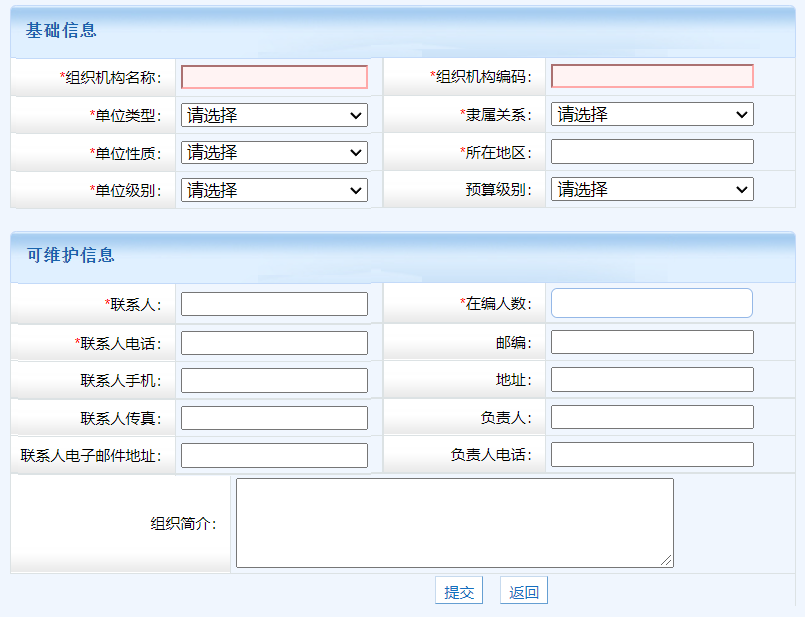 第二步,录入下级单位信息,其中组织机构编码在系统中唯一,其中单位类型、单位性质、单位级别影响系统功能和报表统计,请谨慎选择。