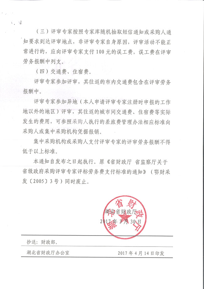 湖北省财政厅关于政府采购评审专家劳务报酬支付标准的通知
